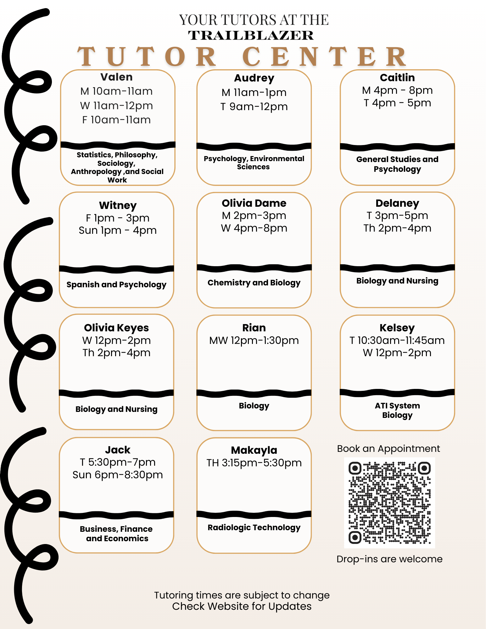 Interested in becoming a tutor for Spring 2026? To be considered, you must have minimally an overall GPA of 2.5 and have earned a B or better in the course you wish to tutor.